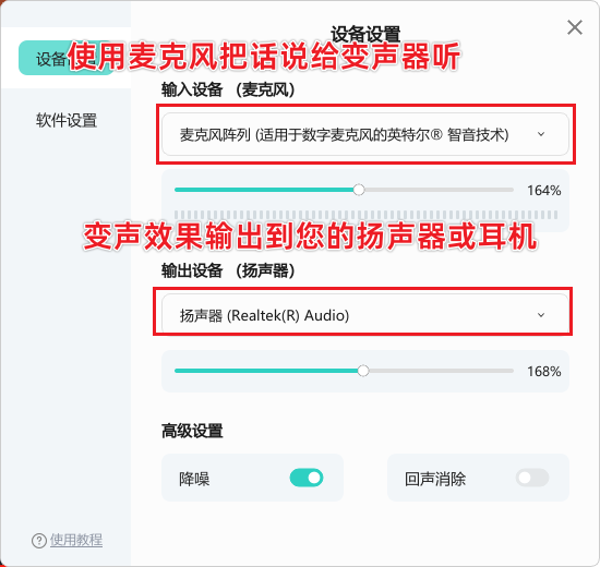 4、你还可以调整声音和音效,打开【变声】、【试听】,然后尝试对着麦克风说话,听听你的声音听起来如何。如果周围环境比较吵闹,可以手动开启【降噪】功能。